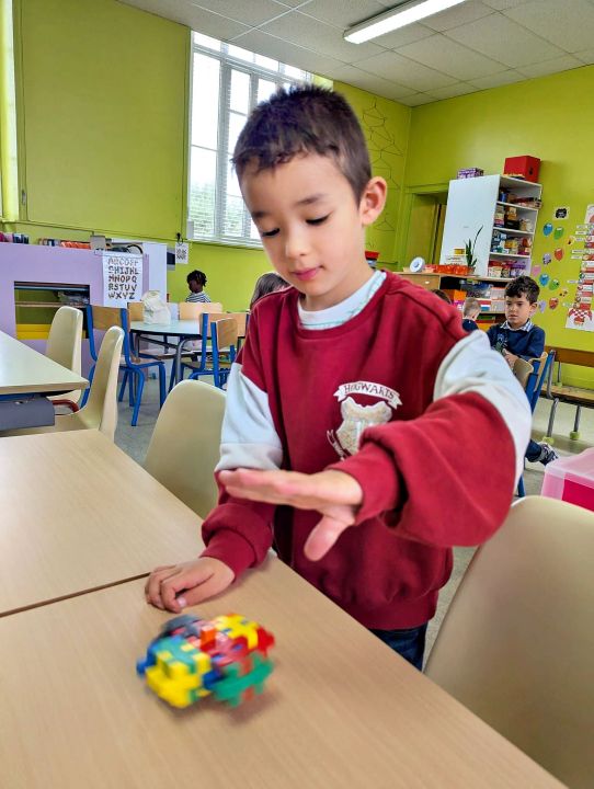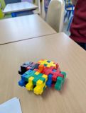 Timothée a inventé une toupie en Plus plus digne d'un ingénieur. Il a appris Lyam à la construire.